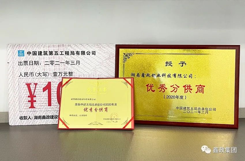 瀏覽次數:1512喜訊連連捷報傳。近日,在中建五局總承包公司2021年分包(供)商答謝會暨優秀分包(供)商表彰會上,集團下屬子公司湖南鑫政鋁業科技有限公司與湖南鑫政建設有限公司分別喜獲2020年度“優秀分供商”與“良好分包商”獎項。
