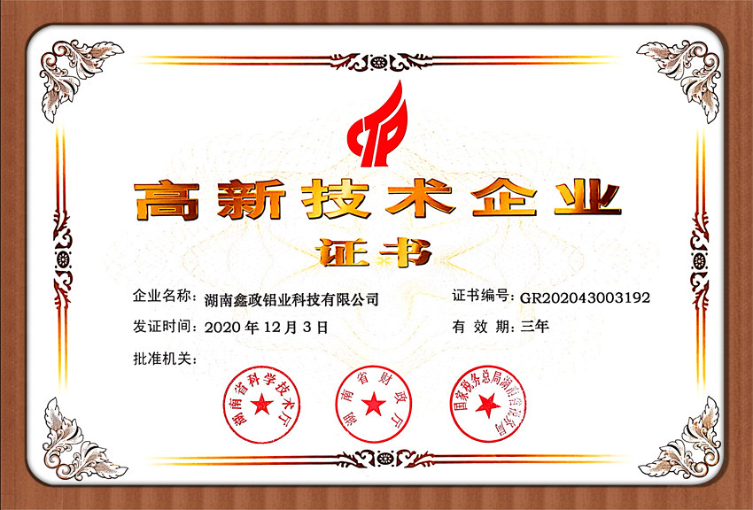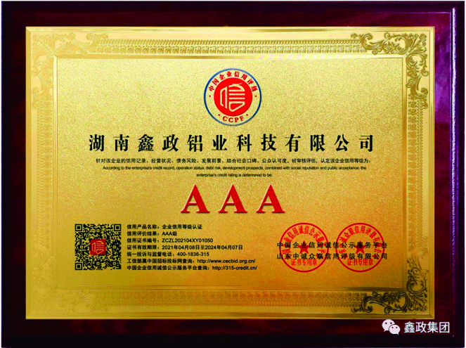 瀏覽次數:1548近日,鑫政集團子公司鑫政鋁業喜報頻傳,再獲殊榮。根據湖南省2020年高新技術企業認定規定,經專家評審、權威公示等程序,鑫政鋁業憑借產品研發、科研人才培養、質量把控等方面的出色表現,榮獲“高新技術企業”榮譽稱號。同時,經過中國企業信用誠信公示服務平臺的嚴格審核,該公司榮獲“AAA級企業信用等級”證書。